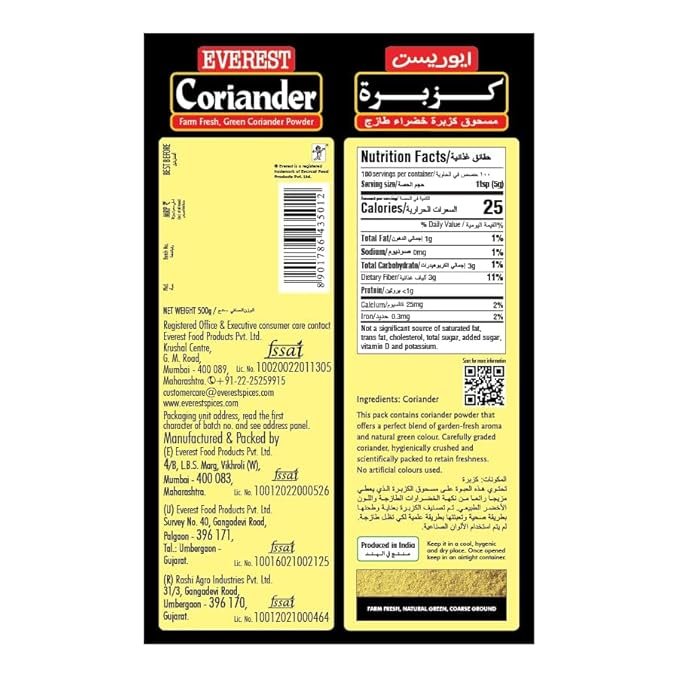 Everest Coriander Powder is a perfect blend of garden-fresh aroma and a natural green colour that thickens gravies and gives it an authentic taste. It widely used to give Indian curries a distinct flavour. It is used for thickening gravies and curries. Has a natural green colour and a fresh aroma that is reminiscent of a herb garden.