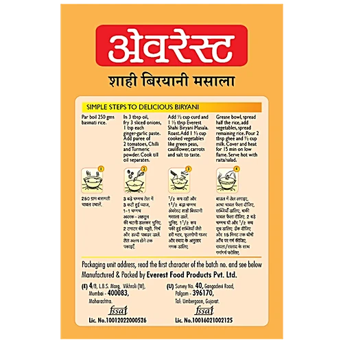 Enjoy a wholesome family dinner with the delicous goodness of royal spices from a tried-and-tested masala blend with Everest Shahi Biriyani Masala, The spice blend gives a flavourful aroma and delicious taste to your Dum Biryani, Made from a blend of spices like cloves, cinnamon, bay leaf, mace, nutmeg, cardamom, black stone flower, caraway seeds, coriander, cumin, and fennel seeds, This premium-quality masala will make your biryani the favourite dish at any family gathering, It is free from chemical preservatives.